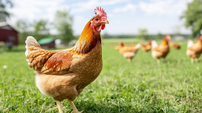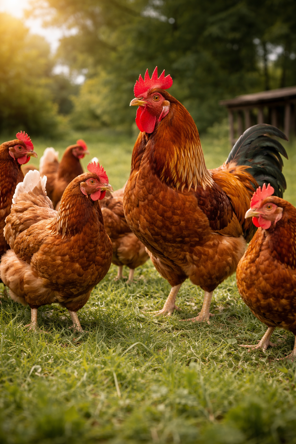 Open pasture living with stress-free, happy chickens roaming naturally.